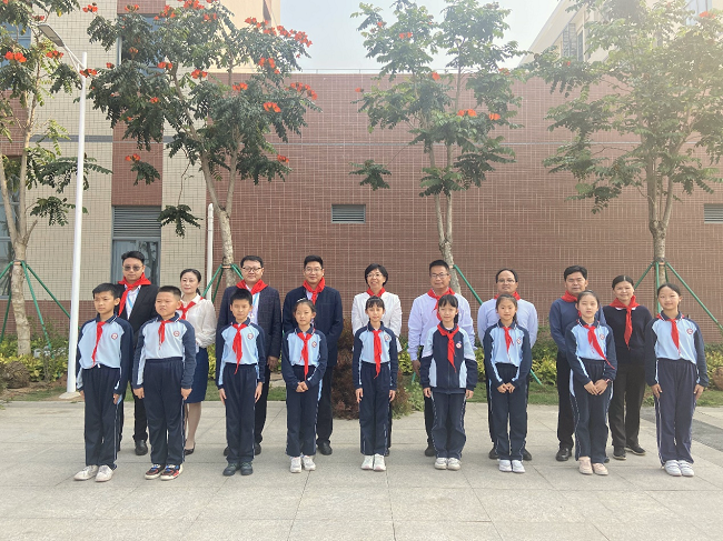 虹暉小學李亞男副校長致歡迎辭。她代表學校歡迎聯(lián)港公司領導蒞臨,并感謝公司為學校綠化美化校園所捐贈了紅楓樹和植樹工具,此舉彰顯了國企風范和社會責任感。