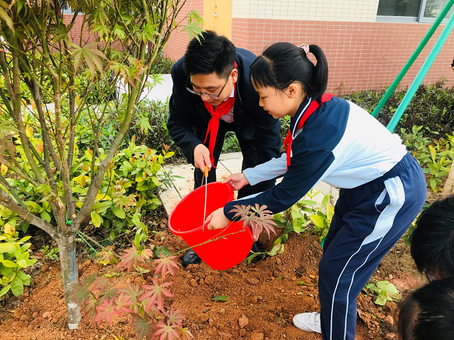 接下來老師、同學和聯(lián)港公司員工大家相互配合,揮鍬鏟土、扶樹填土、培土澆水,一氣呵成,活動現(xiàn)場熱火朝天。經(jīng)過半個多小時的勞動,十棵紅楓樹在綠化帶里“安家落戶”。和風煦日,春日暖陽,大家的辛勤勞動給校園一角添上了一道風景線。