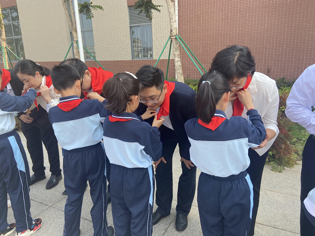 活動伊始少先隊員們?yōu)樗屑钨e戴上了鮮艷的紅領巾,笑容洋溢在每一個人臉上。