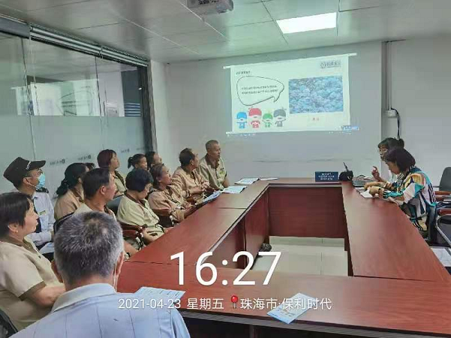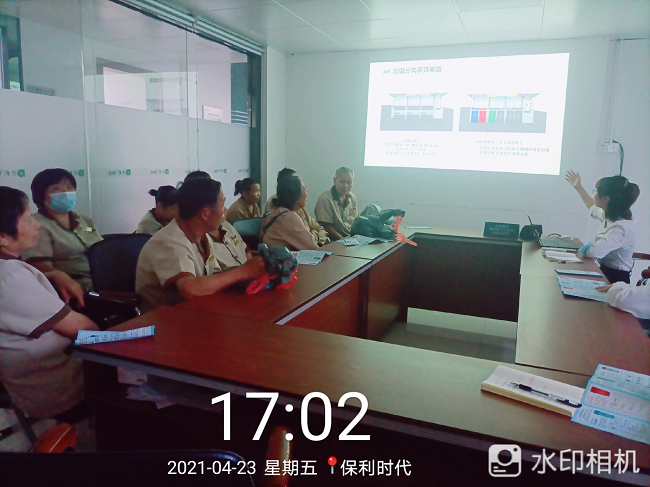 4月23日、24日下午聯(lián)港公司垃圾分類項(xiàng)目宣講員到保利時(shí)代、中海左岸嵐庭小區(qū)開(kāi)展垃圾分類專題培訓(xùn),保利時(shí)代、中海左岸嵐庭物業(yè)管理層和保潔隊(duì)伍等共計(jì)50人,分成兩批參訓(xùn)。聯(lián)港公司垃圾分類項(xiàng)目宣講員受邀前往現(xiàn)場(chǎng)作《垃圾分一分金灣美十分》主題培訓(xùn)。