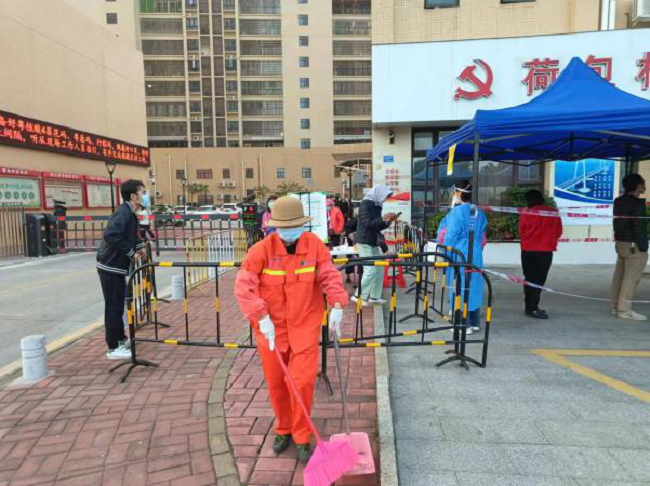 匯建公司環(huán)衛(wèi)工人不畏嚴(yán)寒、盡職盡責(zé),幫助社區(qū)工作人員迅速搭建核酸檢測(cè)設(shè)施,引導(dǎo)社區(qū)居民掃碼,細(xì)致做好核酸檢測(cè)點(diǎn)各項(xiàng)工作,扛起責(zé)任與擔(dān)當(dāng)。